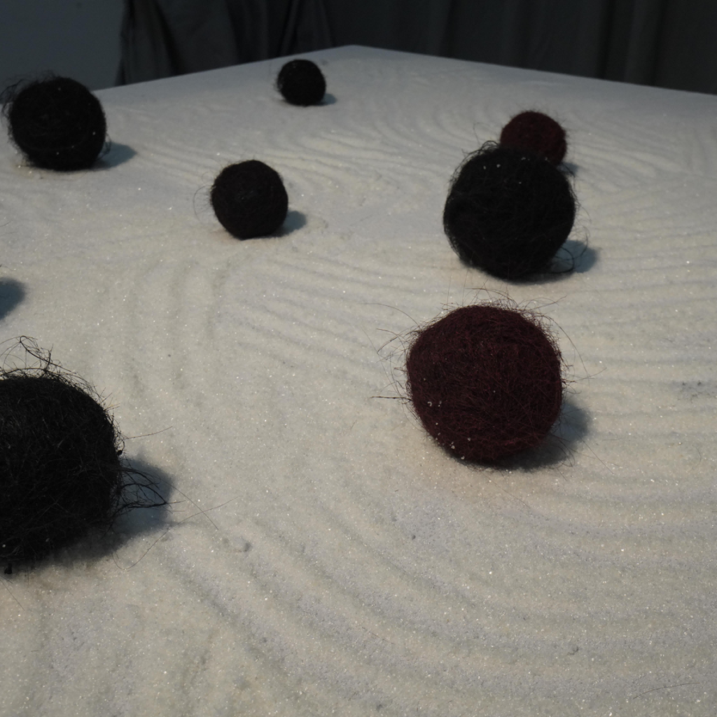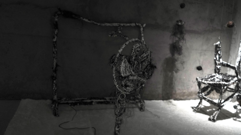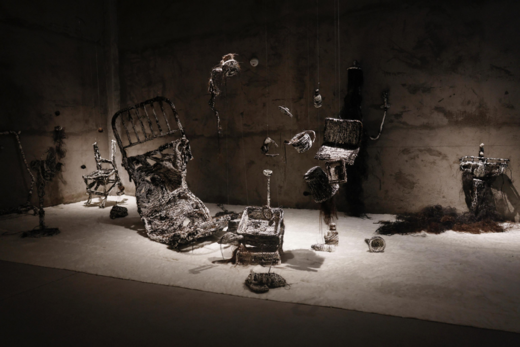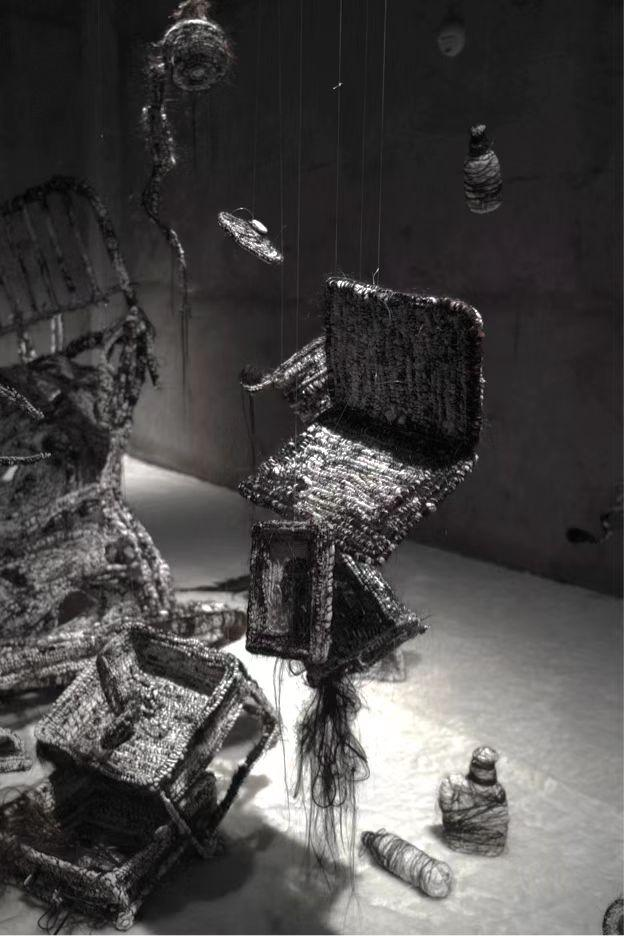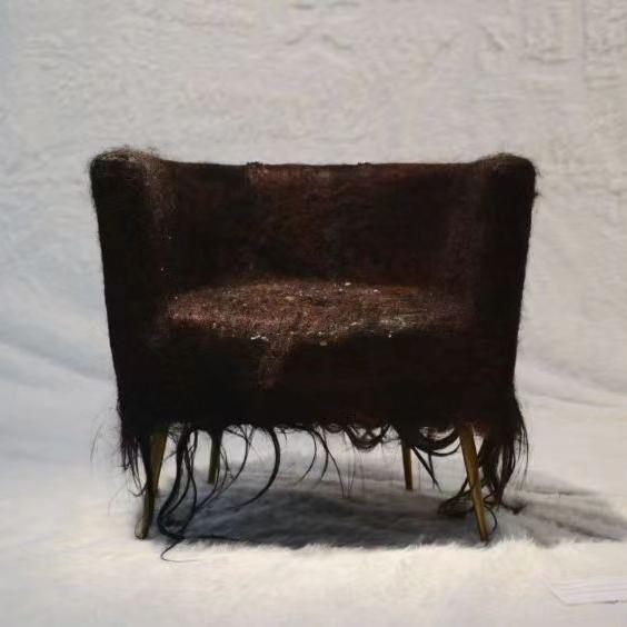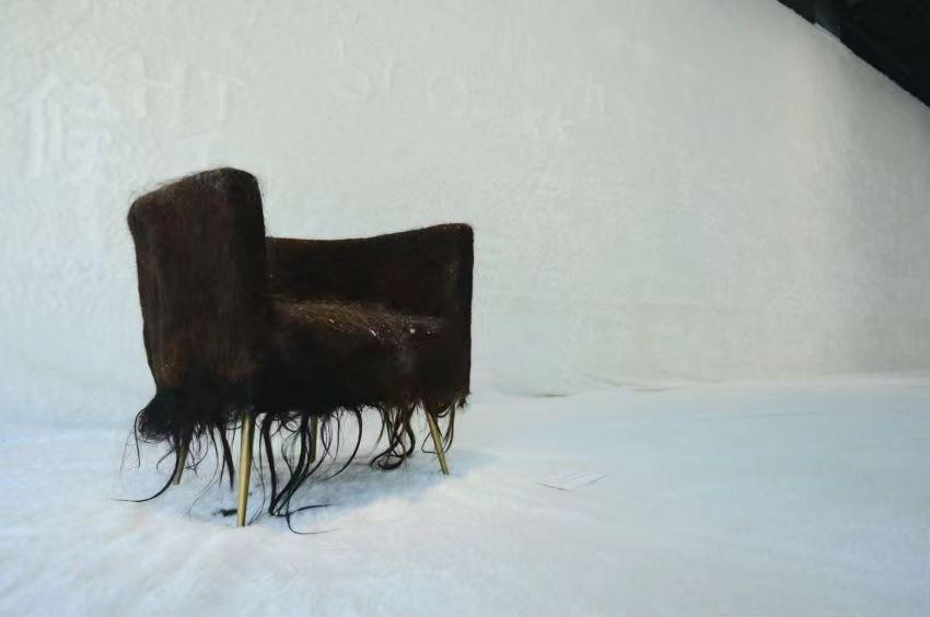 用头发与生活中常见的沙发进行包裹,两种熟悉的材料碰撞在一起时形成的陌生处决,让观者能感受到熟悉与陌生交织在一起的新型触觉。