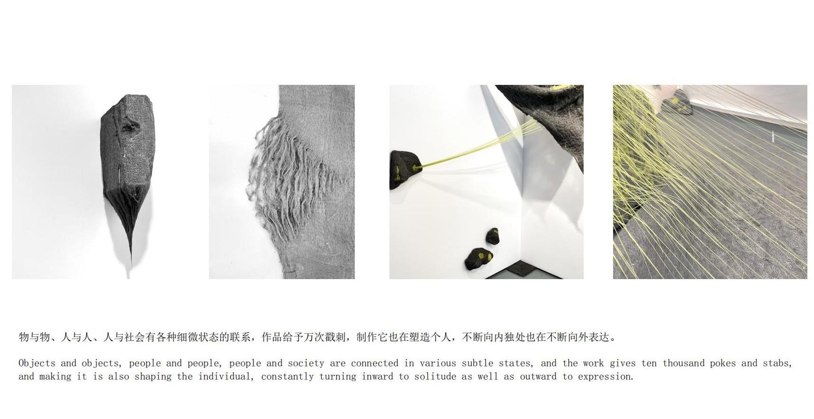 艺术创作目前以综合绘画、装置、影像为主。关注数学与艺 术,偏向以更理性的角度对“物”本身进行思考,关注 “物”的语言。也希望以具有诗性的方式展现“物”之间的 本质关系。